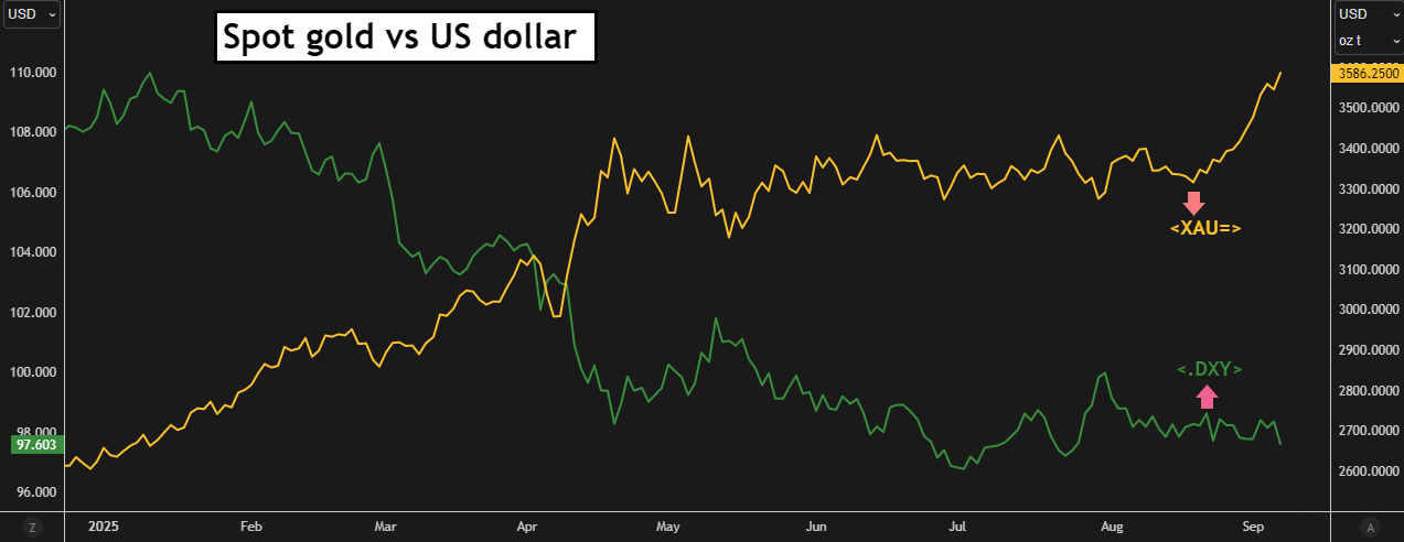 Sự tăng giá mạnh mẽ của vàng đã có thêm động lực vào thứ Sáu, với giá chỉ cách $3600 mỗi ounce vài cents, khi dữ liệu việc làm yếu kém của Mỹ càng nâng cao kỳ vọng cho việc cắt giảm lãi suất của Cục Dự trữ Liên bang Mỹ Fed nhằm hỗ trợ kim loại quý này.